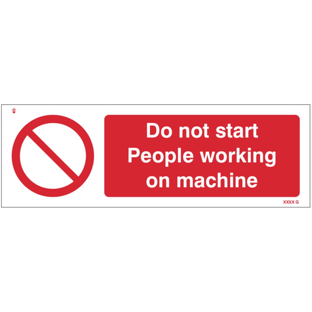 This prohibition sign highlights that machinery should not be started due to the fact that people are working on the machinery and may be injured
