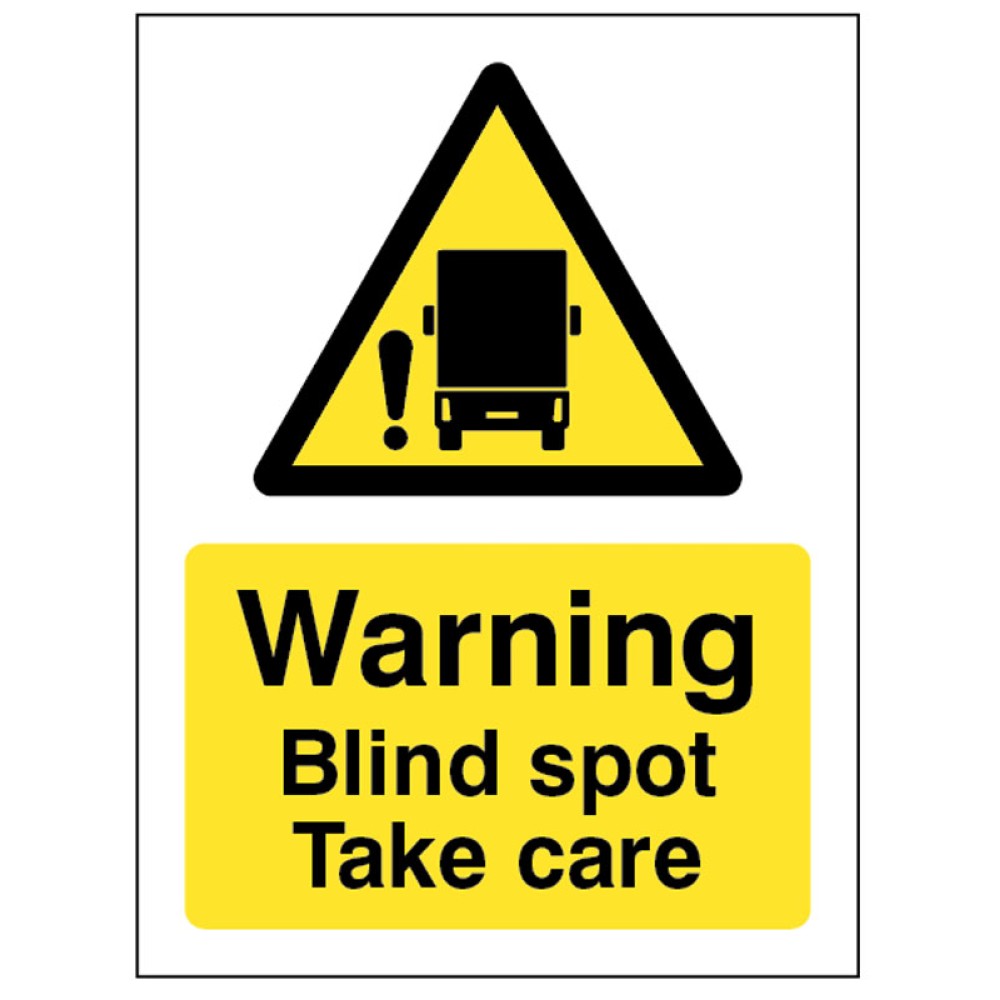 Warn pedestrians, cyclists and motor cyclists of the dangers of undertaking a lorry or bus on a bike with this Blind Spot Take Care hazard warning sign.