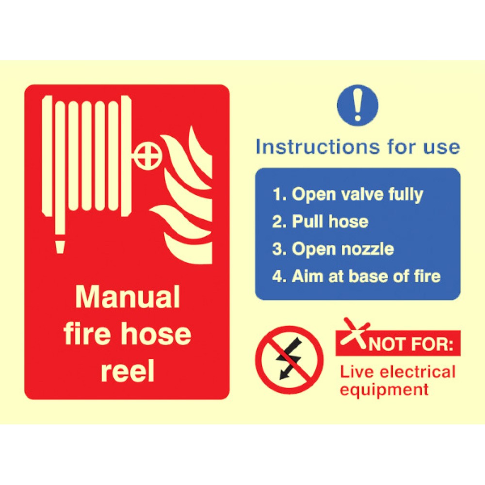 This fire safety sign not only instructs readers how to properly use a fire safety hose in an emergency, but also highlights the location of the fire safety hose. Under the Regulatory Reform - Fire Safety Order 2005 any non-automatic fire fighting equipment should be identified with an appropriate sign. The signs should be positioned and designed in accordance with BS EN ISO 722 to ensure maximum levels of comprehension.