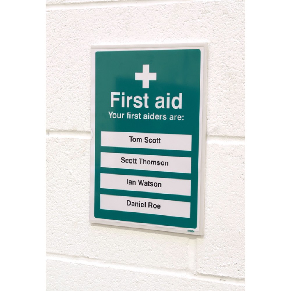 A cost effective First Aid sign which allows you to change the sign easily and efficiently. This enables you to ensure your first aider names remain up to date at all times. Adapt-a-signs hold a standard A4 sheet of paper, which you can simply print off with the relevant details and insert into the sign frame.
