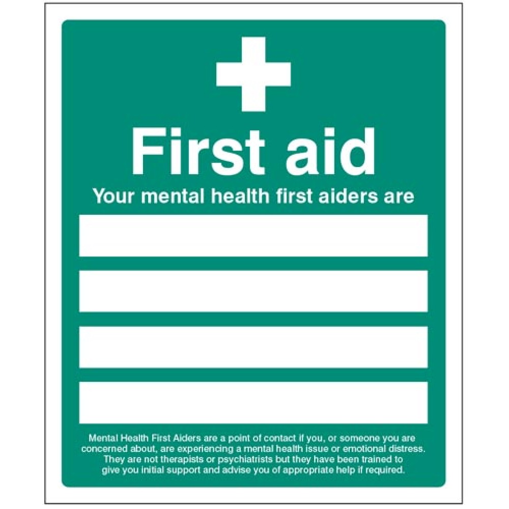 Understanding and tackling mental health and wellbeing issues are becoming increasingly important within the workplace, this new sign identifies first aiders who have been trained to help individuals talk through any such issues