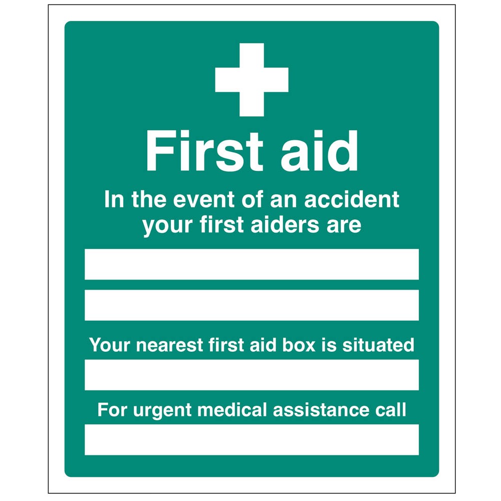 This sign helps to identify key first aid equipment by providing management with spaces to insert the locations / details / names of: First Aiders, Fist Aid Box, Emergency Contact details