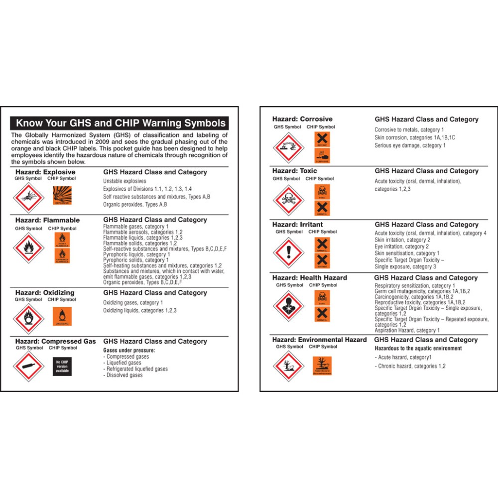 The pocket guide says: The Globally Harmonized System (GHS) of classification and labeling of chemicals was introduced in 2009 and sees the gradual phasing out of the orange and black CHIP labels. This poster has been designed to help employees identify the hazardous nature of chemicals through recognition of the symbols shown below.