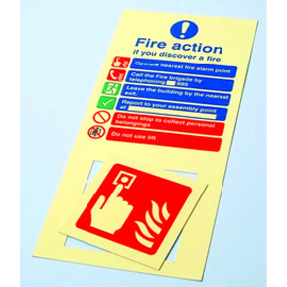 Fire action EasiKITs are manufactured from self adhesive photoluminescent material with an aperture to accommodate regulation size fire alarm call points. Simply pop out the call point symbol and apply main sign over call point box then position the popped out symbol on wall above call point at a height of between 1.7 and 2.metres from ground level.